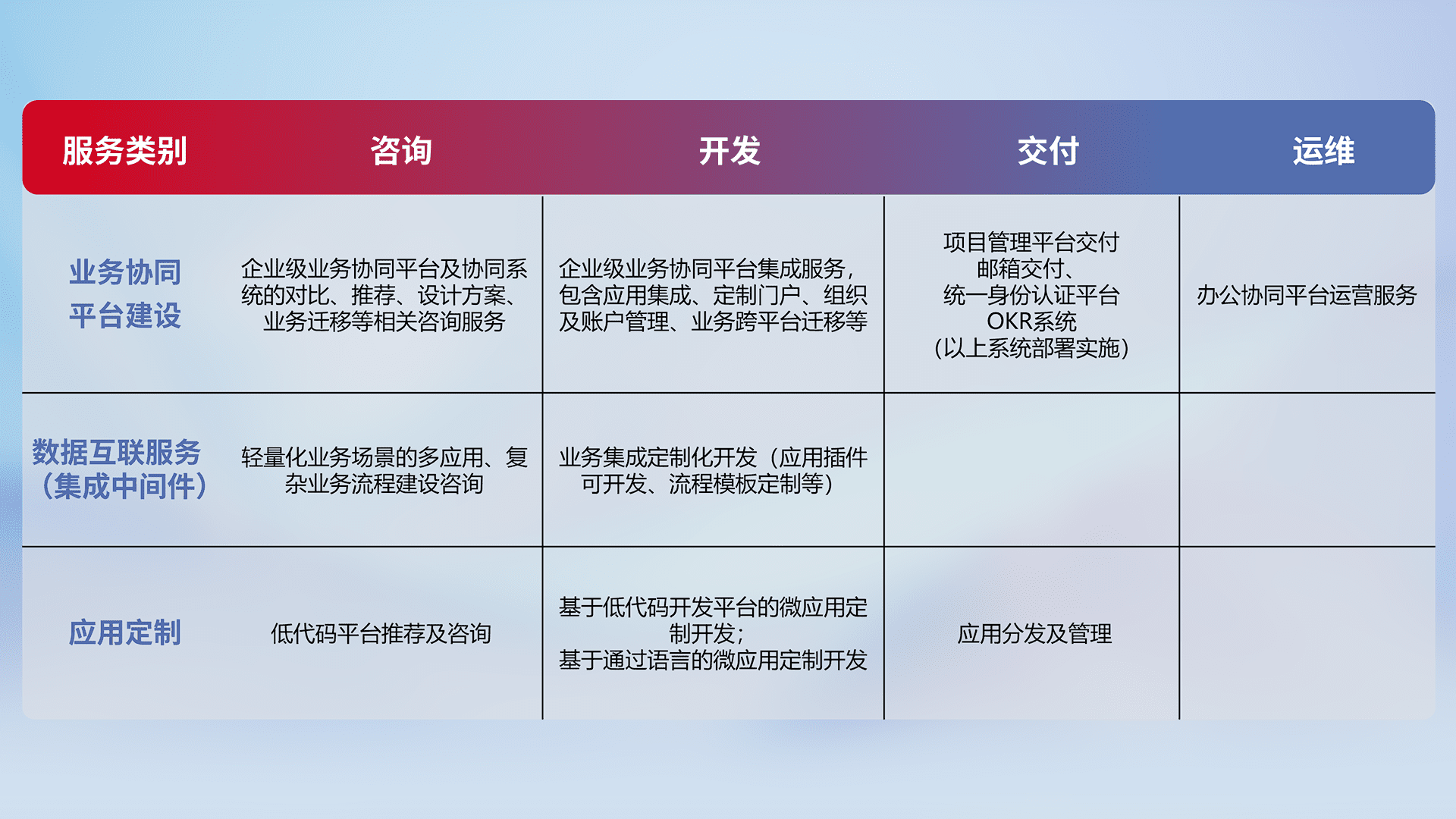 针对钉钉、、企微、、、IDaas等平台级产品提供产品的规划、、、、方案、、、、交付、、、、定制化开发等服务,,,,实现如统一协同办公、、智能客户服务、、、混合会议管理、、、、智能数据查询、、等业务场景,,,,实现数字化转型。。